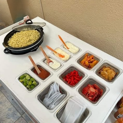 Esquites are ready to be prepared and topped with mayo, cheese, lime, and chili.